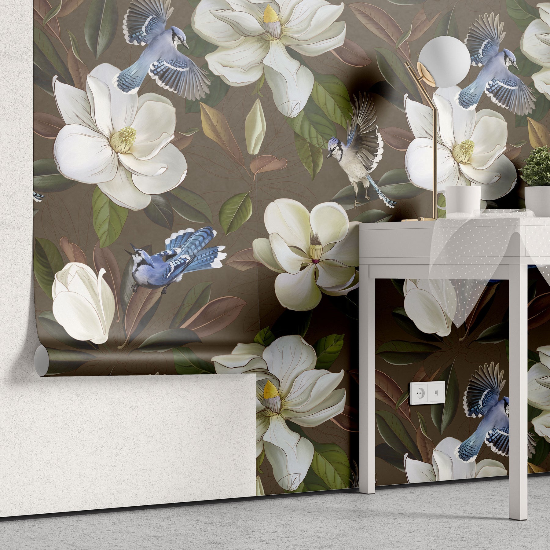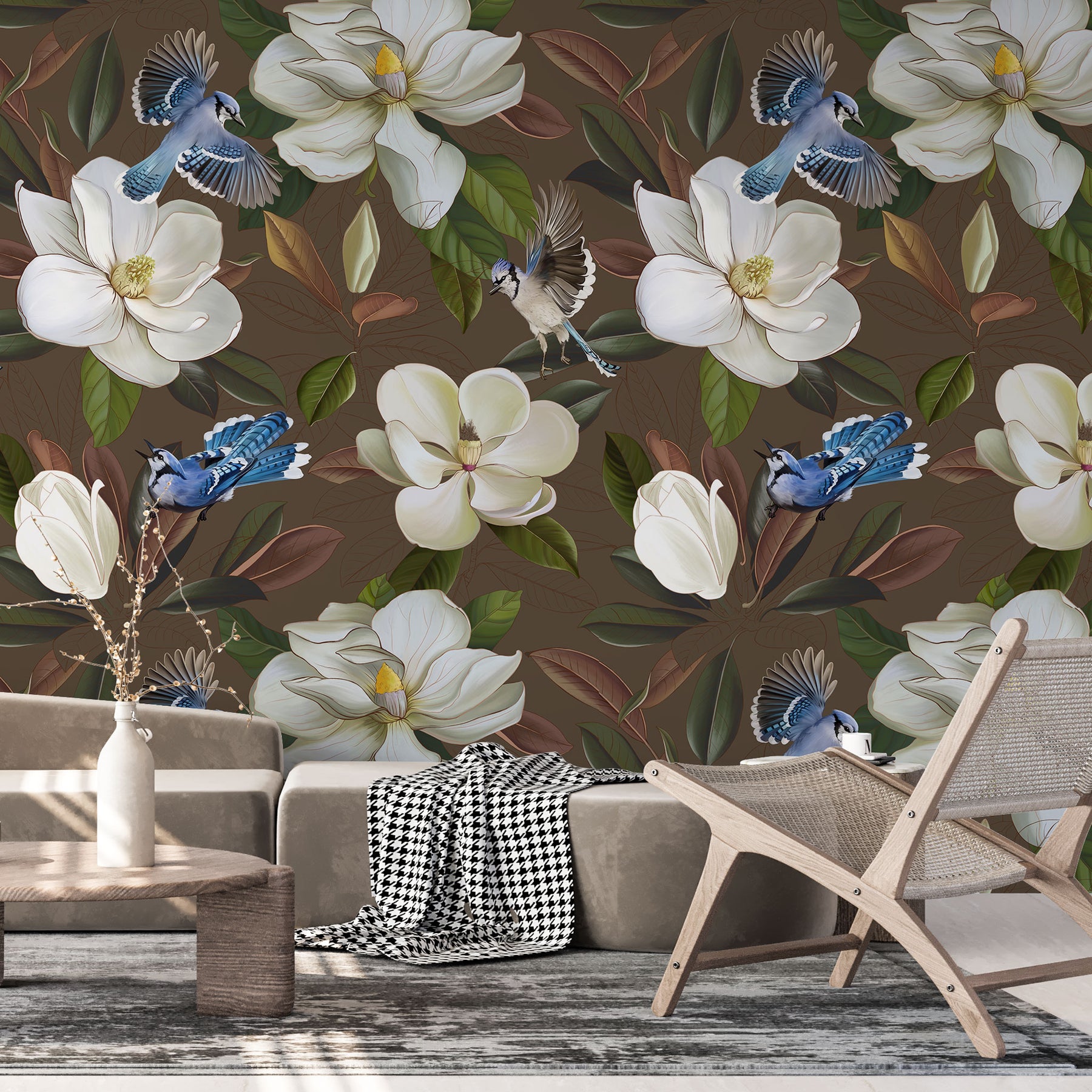Tapet personalizat Floral cu flori de Stewartia pe un fundal maro - BLUE BIRD STEWARTIA I